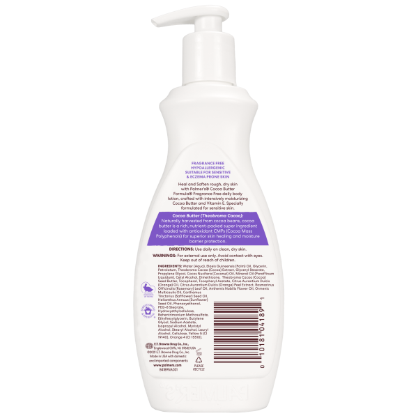 Heal and Soften rough dry skin with Palmer's Cocoa Butter Formula Fragrance Free daily body lotion, crafted with intensively moisturizing Cocoa Butter and Vitamin E. Specially formulated for sensitive skin. Proudly made in U.S.A., Palmer's® has been a trusted brand for over 180 years, providing high-quality natural products that are passed down from generation to generation. America's #1 Cocoa Butter brand Palmer's Cocoa Butter Formula uses the highest quality natural ingredients for superior moisturization head-to-toe.